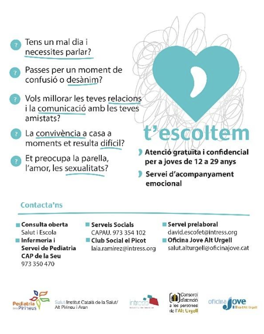 • T’escoltem. Servei d’acompanyament emocional, confidencial i gratuït per a joves de 12 a 29 anys.